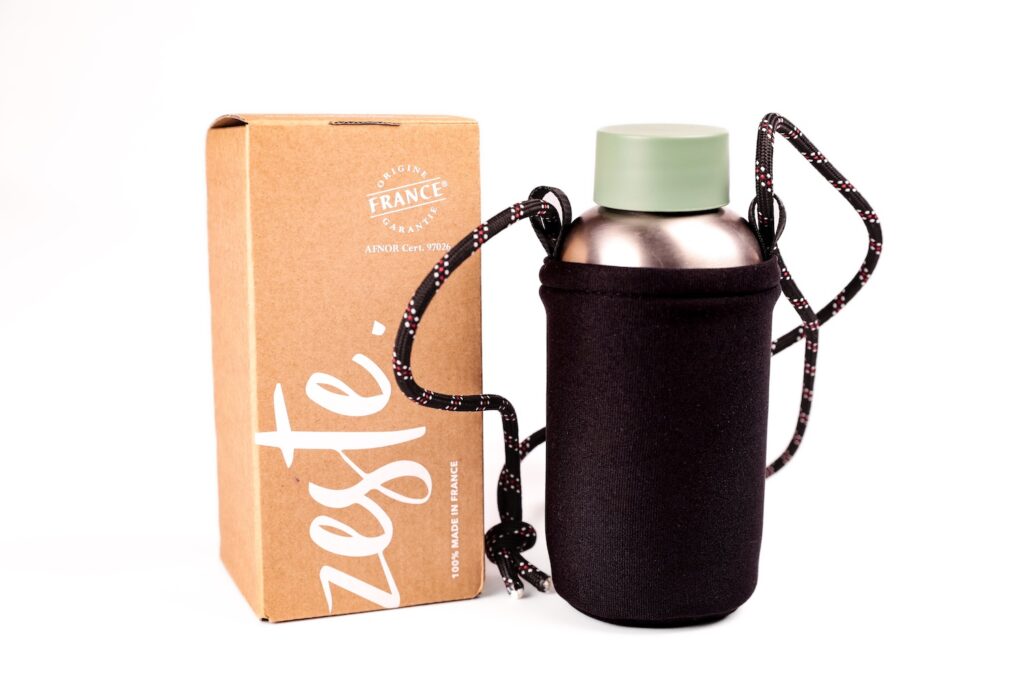 La Gourde Zeste est la seule gourde à être 100% Made in France. En plus de son design élégant, elle est aussi garantie à vie et vous accompagnera partout pendant vos voyages, balades et randonnées. Elle est aussi isotherme et conservera boissons chaudes et froides à la bonne température. Avec son format compact, elle est facile à glisser dans un petit sac. Pour savoir où la remplir gratuitement, le dispositif Soif de Rennes vous indique les fontaines à eau à proximité. Format 0,5 litre, la gourde est fabriquée en Bretagne (29€), sa housse isotherme est fabriquée en France (16€).
