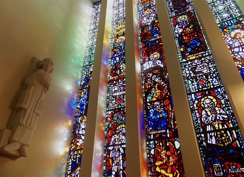 Détruite au cours des bombardements de la fin de la Seconde Guerre Mondiale, la chapelle du patronage de la Tour d'Auvergne est reconstruite entre 1949 et 1950, suivant les plans de l'architecte Louis Chouinard. Celui-ci utilise sa pierre fétiche, un schiste pourpre teinté de vert de la carrière du Rohuët en le Verger. Pour les décors, il fait appel au sculpteur Francis Pellerin, grand prix de Rome, à la peintre Adelyne Neveux et au maître-verrier Loire de Chartres.
