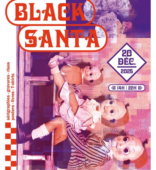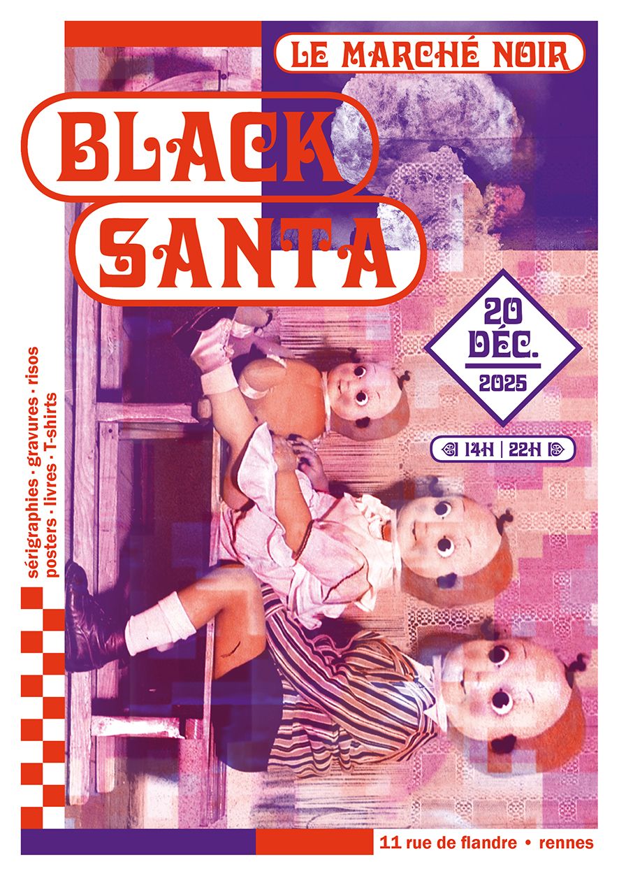 Quelques jours avant Noël, nous ouvrons l'atelier au public pour proposer notre "Black Santa", un marché de Noël dédié aux arts graphiques qui se déroule durant une après-midi et une soirée. Nous y mettons en avant une sélection de pièces diverses principalement issues des arts graphiques et imprimés : estampes en gravure et en sérigraphie, affiches riso, livres, cartes postales, textiles, petits objets… toutes produites dans l'atelier.