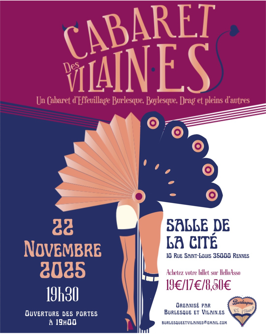 Glamour, plumes, paillettes, fantaisie, humour et sexyness… Rennes, prépare-toi pour le grand retour du Cabaret des Vilain·es : l'évènement burlesque inoubliable à ne pas rater. Venez assister au spectacle et découvrir d'incroyables artistes haut·es en couleurs, dans l'ambiance des Grands Cabarets. Sortez vos plus beaux vêtements, bijoux, perles, plumes et strass et rejoignez-nous pour 2 heures de show de folie ! La soirée sera présentée par Monsieur Paul Piette, accompagné des stage kittens : Arsenic Simone & Mo La Rouge. Sur scène, une diversité de talents :