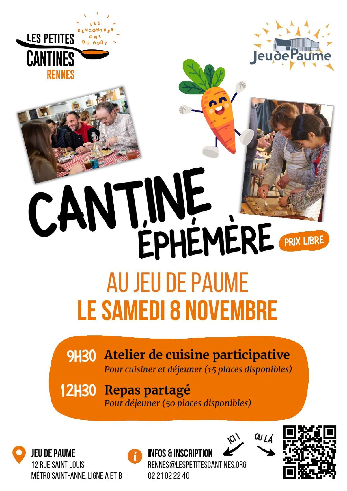 Venez partager un moment gourmand, convivial et joyeux autour d’un bon repas. Pour ce déjeuner organisé en partenariat avec Les Petites Cantines Rennes et le Jeu de Paume, nous mettons à l’honneur des produits de saison et locaux, cuisinés avec enthousiasme et partagés dans la bonne humeur. Il est ouvert à tous : petits et grands, gourmands et timides, chacun est le bienvenu ! L’inscription est obligatoire pour gérer au mieux les stocks et l’accueil de chacun.