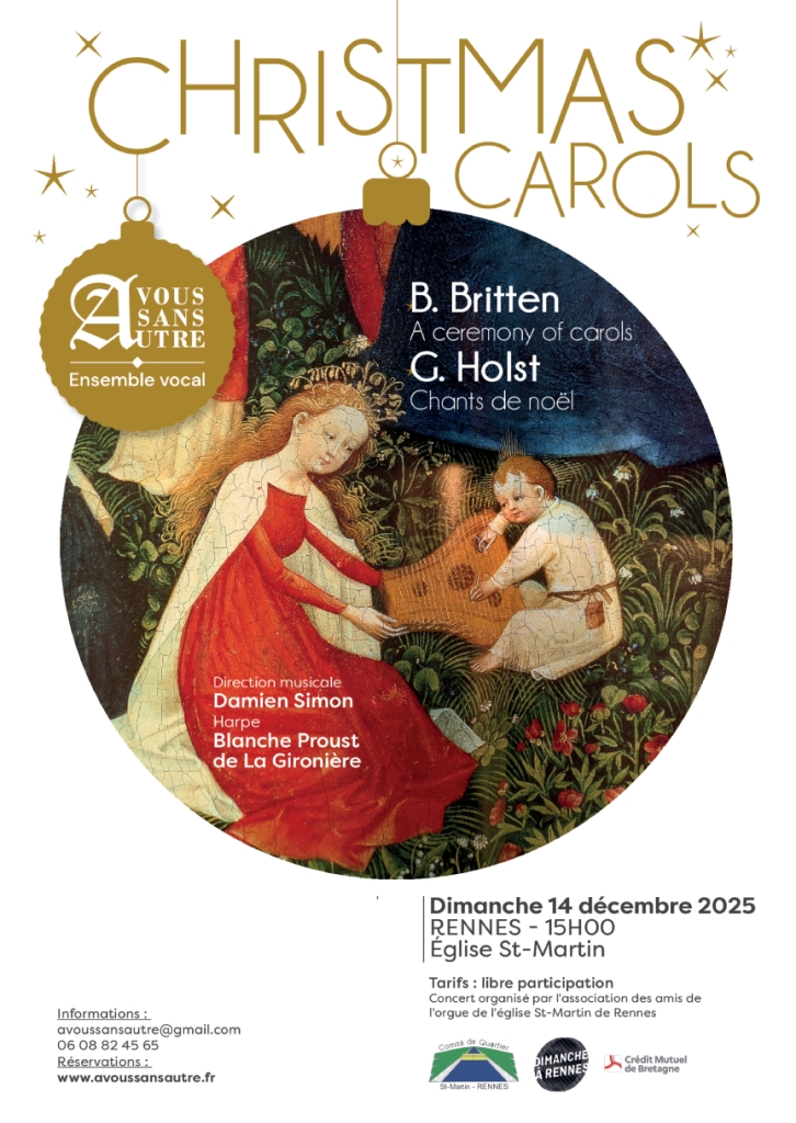 A Vous Sans Autre compte actuellement une vingtaine de choristes et est dirigé par Damien Simon, professeur d’orgue au Conservatoire Régional de Rennes et titulaire des orgues de la Cathédrale de Strasbourg. Le chœur sera accompagné par la harpe.