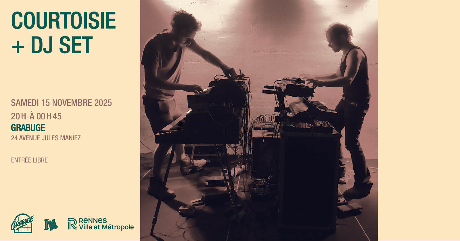 Des synthés, des synthés et encore des synthés : armés de leurs claviers, les deux Rennais de Courtoisie composent d’entêtantes et hypnotiques mélodies électroniques. Une variation pour claviers pas si tempérés ni très courtois, qui invite à danser les yeux fermés et à décoller vers d’autres dimensions synth-wave avec John Carpenter comme pilote.