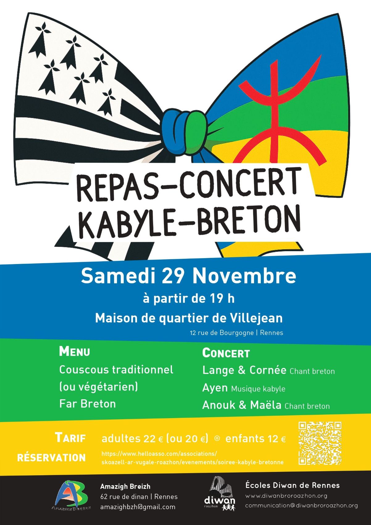 Soirée Bretagne - Kabylie : rencontre des cultures en musique et en saveurs ! Les associations Diwan Bro Roazhon et Amazigh Breizh vous invitent à une soirée festive placée sous le signe du partage entre la culture bretonne et la culture kabyle.