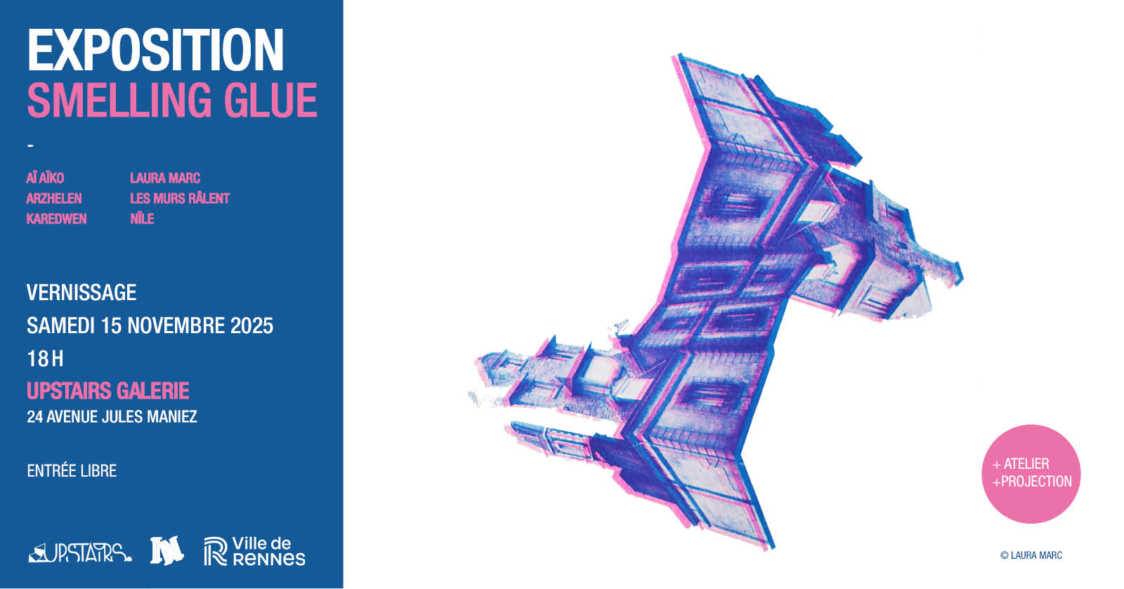 L'exposition Smelling Glue se concentre sur le collage papier avec Laura Marc et Hélène Arzh, sur le collage urbain avec le collectif rennais Les Murs Râlent. Puis sur la porosité entre ces deux univers avec Karedwen, Nïle et Aï Aïko.