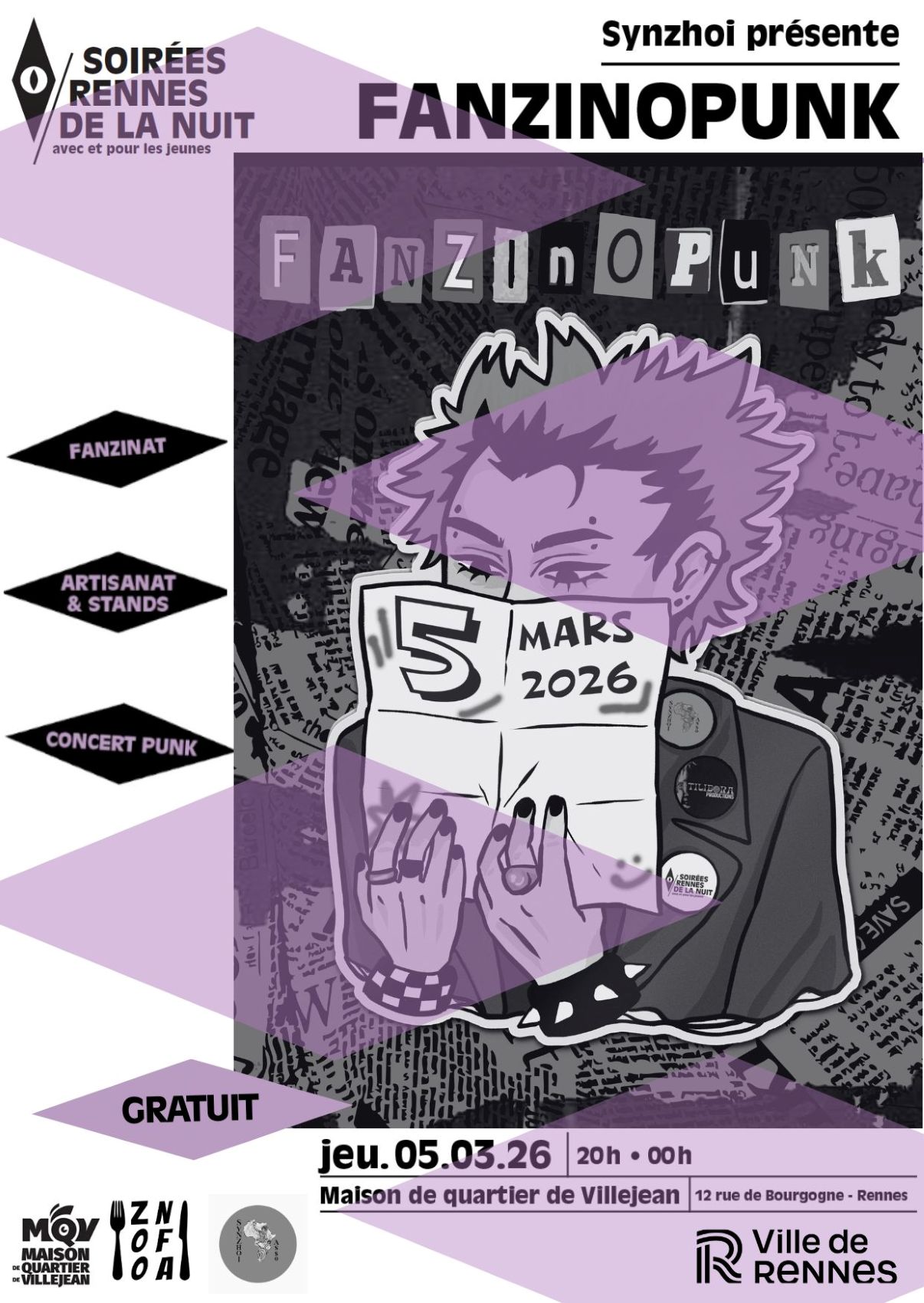 Portée par l’association Synzhoi, dans le cadre du dispositif Rennes de la Nuit, la soirée Fanzinopunk est un projet élaboré par une équipe jeune et engagée. Il s’agit d’un événement culturel gratuit et inclusif, ayant pour but de valoriser des pratiques indépendantes, de fédérer des associations locales et de mieux faire connaître l’univers du Punk à travers ses différents moyens d’expression.