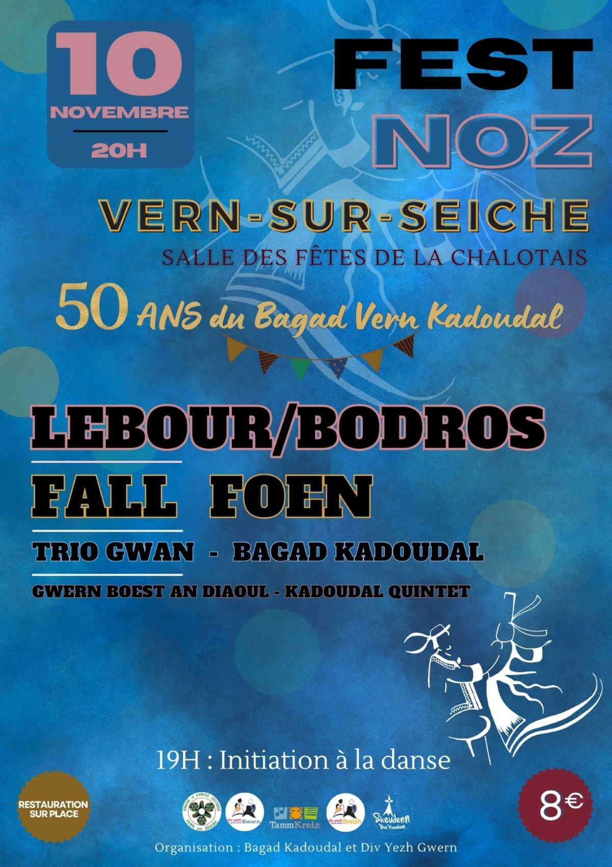 Le Bagad Kadoudal fête cette année ses 50 ans. Situé à Vern-Sur-Seiche, il anime depuis toutes ces années de nombreuses animations sur différents territoires. Le 11 novembre, la scène sera belle : Lebour/Bodros, Fall Foen, Trio Gwan, Bagad Kadoudal, GwenBoest an Dioul, Kadoudal Quintet. Une initiation à la danse sera proposée à 19 h. Venez apprendre, danser, chanter !