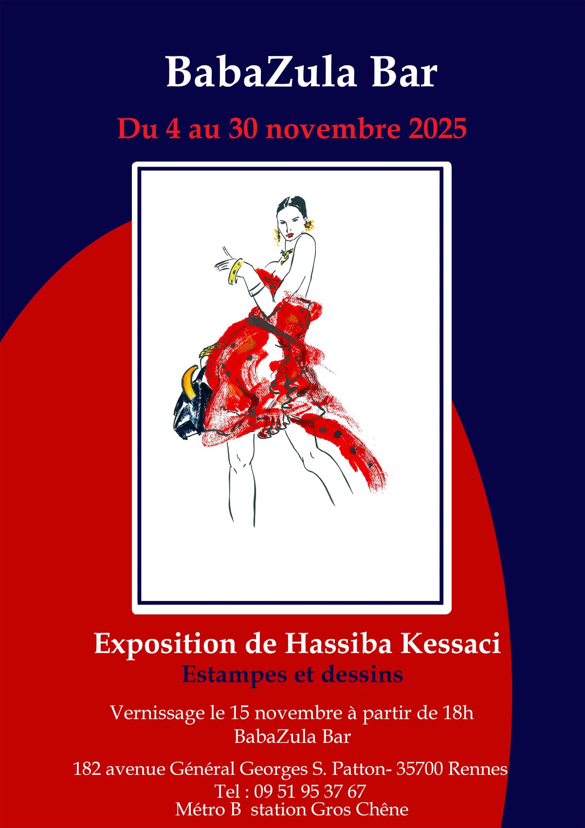 L’exposition au bar culturel le BabaZula Bar est une exposition artistique qui part du thème de la mode pour une déambulation intérieure libre. Ses œuvres sont des estampes contemporaines, des dessins au feutre ou à la plume et encre de Chine ainsi que des peintures. Elles explorent la mode comme émanation de l’individu: entre spiritualité et désir, entre individualité et société, entre fantaisie et discrétion, entre sensibilité et rationalité, la question du genre. Hassiba Kessaci a travaillé avec ses propres modèles pour son travail artistique sur la mode. Son exploration a été jalonnée de rencontres rennaises : styliste, illustrateur de mode, responsable de multimarques … Elle a été en contact avec l’école française de mode ESMOD présente à l’international, notamment pour des croquis de mode live lors des défilés de mode de fin d’année des étudiants de l’école. Son exploration a été tournée également à l’international, notamment par sa formation au London College of Fashion.