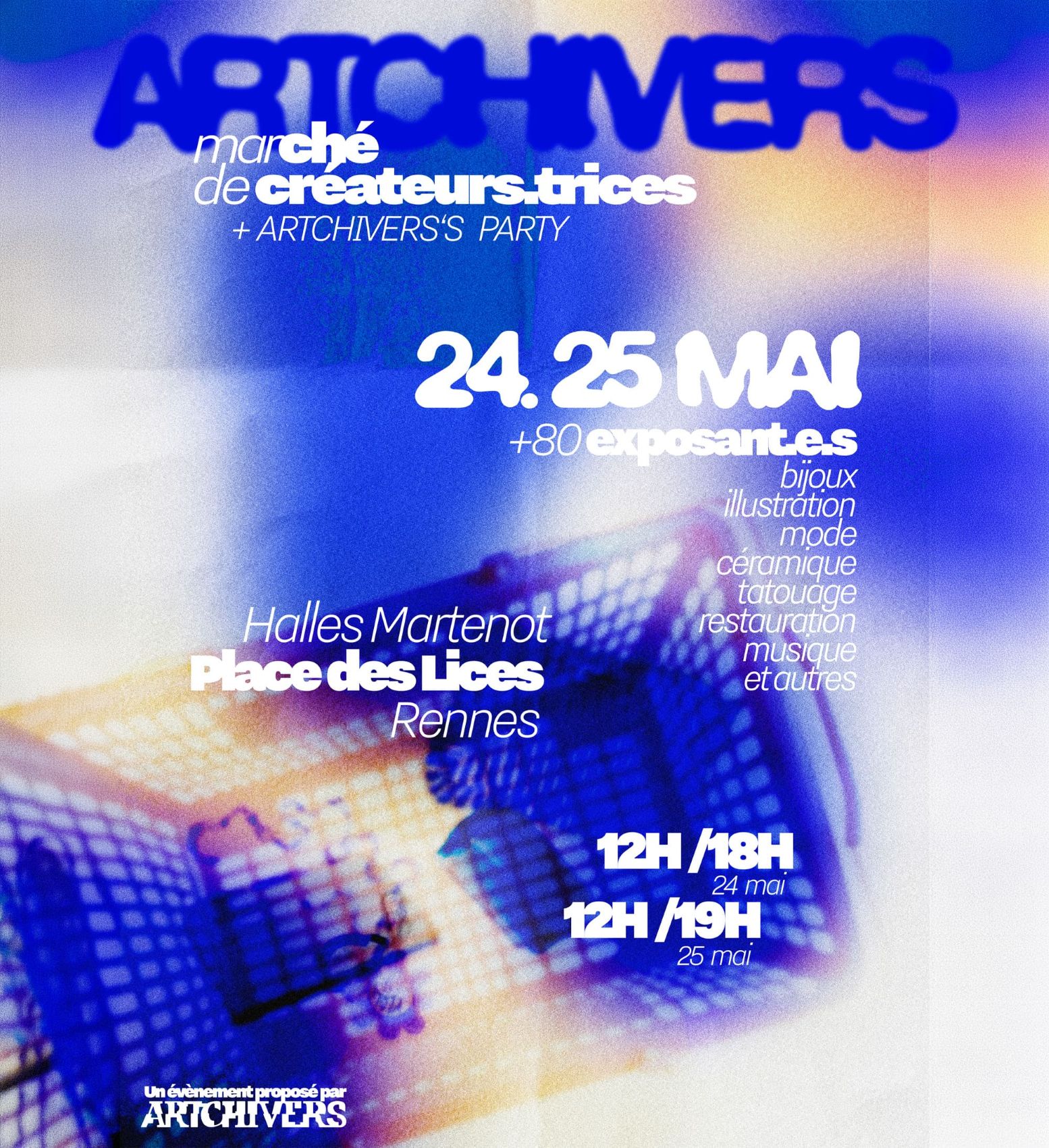 Les 24 et 25 mai 2026, Artchivers s'installe pour la troisième fois dans la Halle Martenot, pour faire découvrir plus de 80 projets créatifs locaux au public rennais. Au programme, des créations locales en tous genres, un espace "chill" avec de la musique et de la restauration tout au long des deux jours, et toujours la même ambiance chaleureuse !