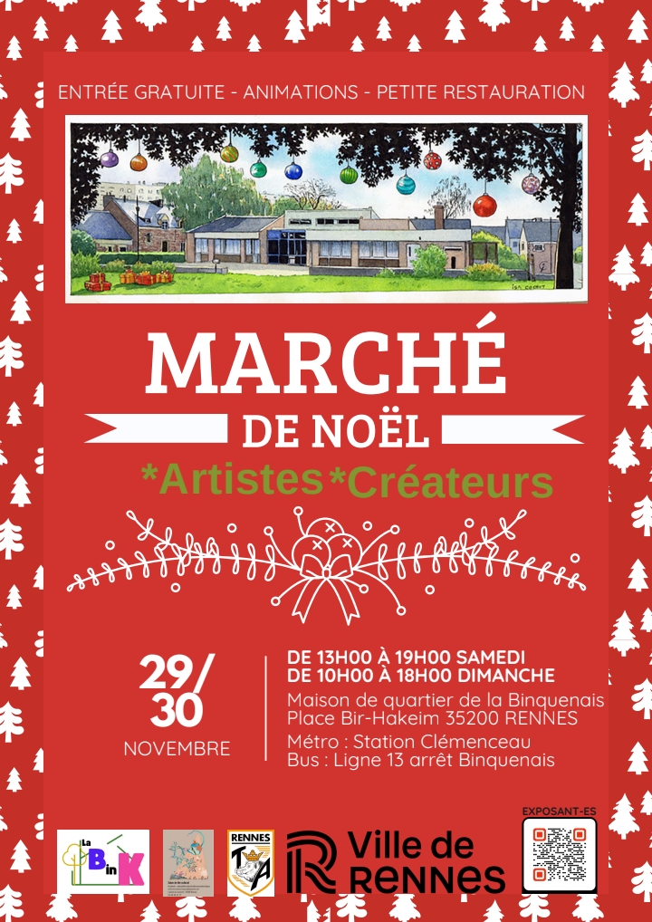 Marché de Noël de la maison de quartier de la Binquenais. Créateurs et créatrices seront heureux de vous accueillir du samedi 29 novembre de 13 à 19h et le dimanche 30 novembre de 10h à 18h00. Venez nous rencontrer.