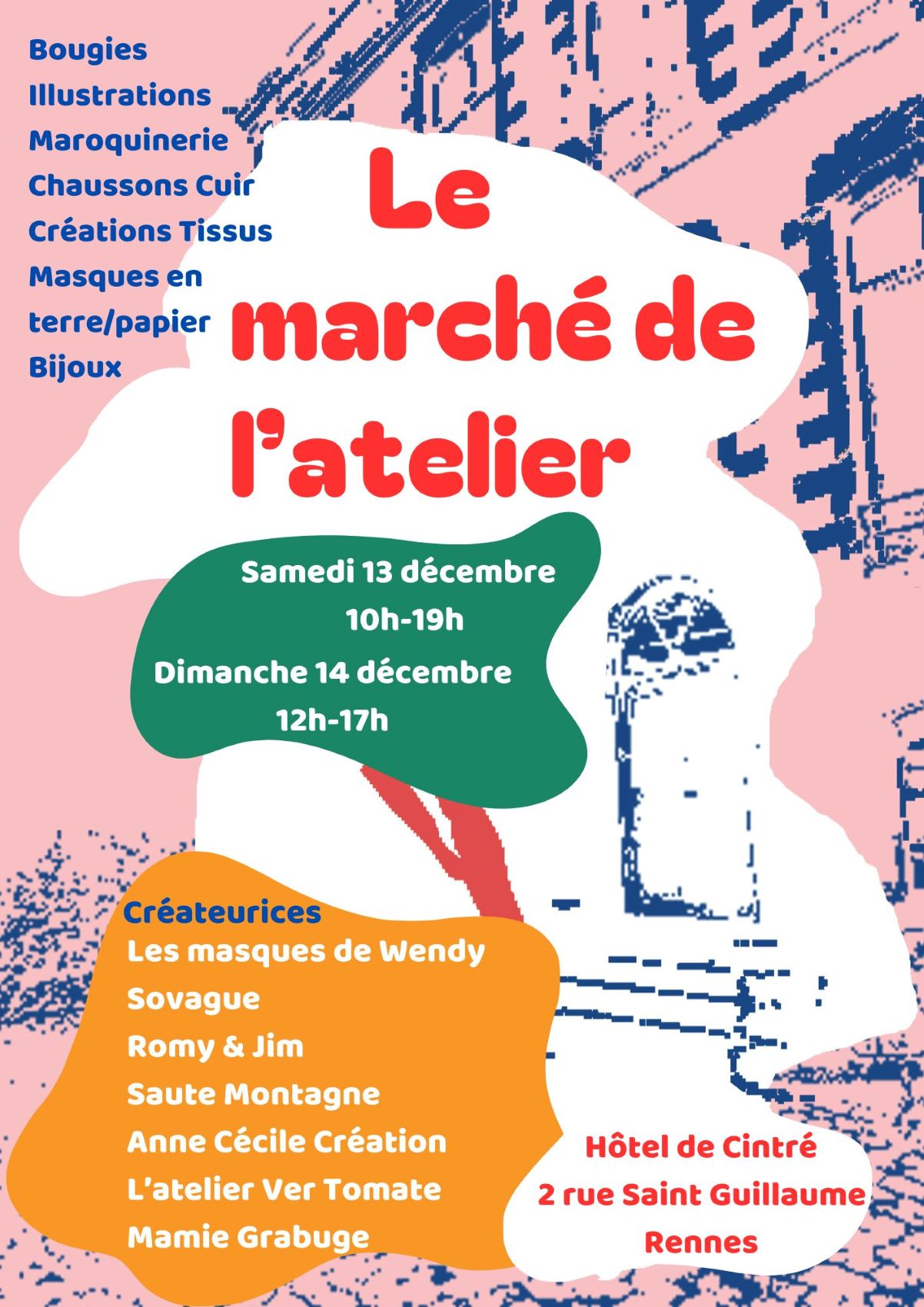 Le Marché de l'Atelier vous ouvre les portes de son atelier de création, niché au cœur du vieux centre de Rennes, près des Lices, pour un rendez-vous chaleureux et authentique. Le temps d’un week-end, plongez dans l'univers où naissent les créations artisanales et rencontrez les créatrices invitées dans une atmosphère conviviale. Vous y découvrirez un bel éventail de créations locales : bougies, illustrations, maroquinerie, chaussons en cuir, créations textiles, masques en terre/papier, bijoux et décorations… le tout façonné avec soin et créativité.