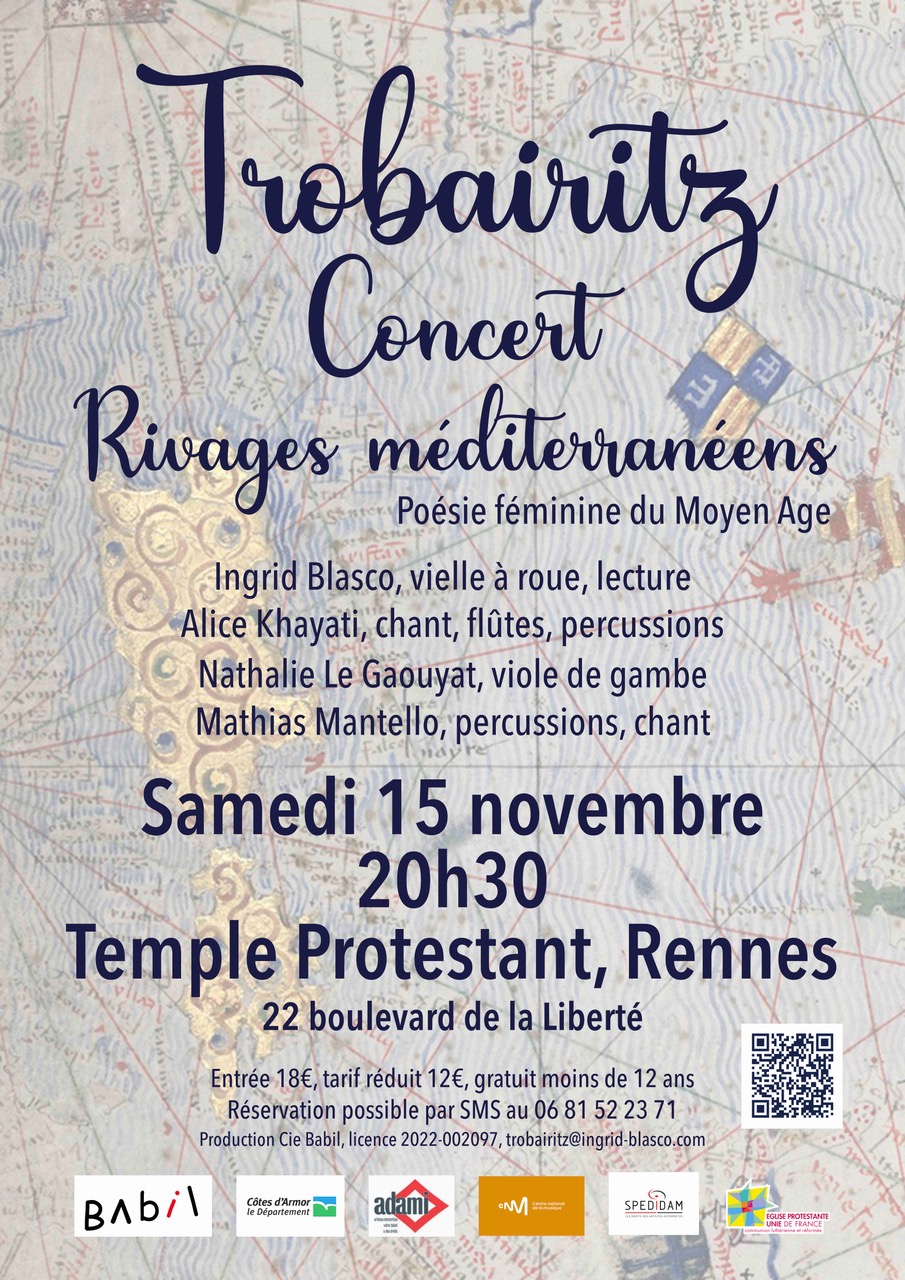 Autour de la compositrice et joueuse de vielle à roue Ingrid Blasco, Trobairitz rassemble la mezzo-soprano Alice Khayati, le percussionniste Mathias Mantello, et la gambiste Nathalie Le Gaouyat. Leur travail fait revivre des poésies féminines anciennes et leurs autrices oubliées, à la lumière des compositions contemporaines d'Ingrid Blasco, et les fait ainsi passeuses et passeurs de mémoire.
