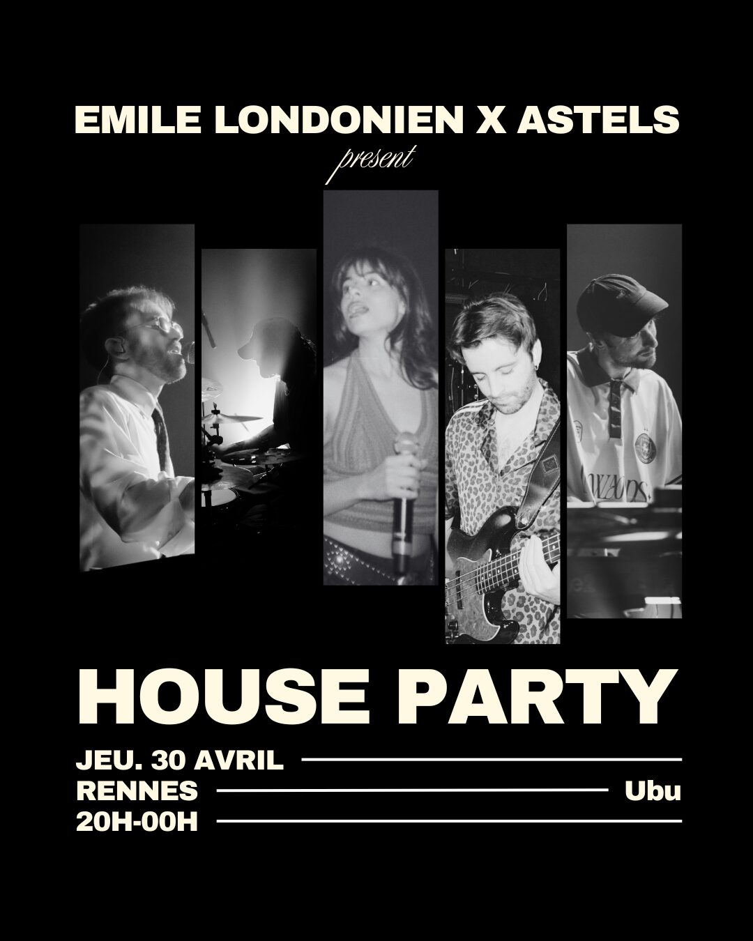 Le trio strabourgeois Emile Londonien, connu pour son sens du groove et son univers à la croisée du jazz, de la house et du broken beat, débarque à l’Ubu accompagné du duo R&B/funk/electro Astels, formé par Camille (voix) et Théo (multi-instrumentiste), pour une House Party !!
